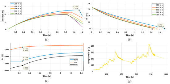 Figure 6 depicts the results from the lap simulations of the calculated braking distance and velocity of the car and the distribution of the longitudinal forces, in the case of braking, from 120 km/h to 0 km/h. In addition, a temperature-time diagram is presented based on the sensor’s data.