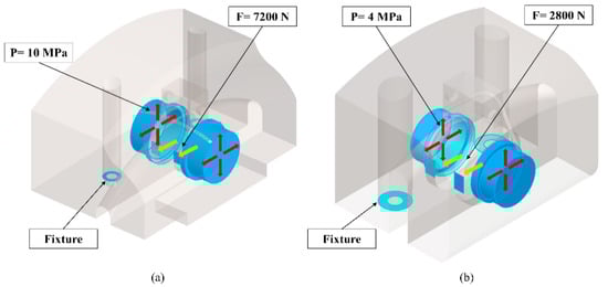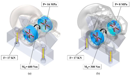 t = 7200 N, were applied at the pistons’ area of the front housing. Furthermore, the housing was fixed with two bolts to the upright. These bolts were replaced in the simulations by two fixtures to reduce the simulation time. On the other hand, the pressure and the surface traction were