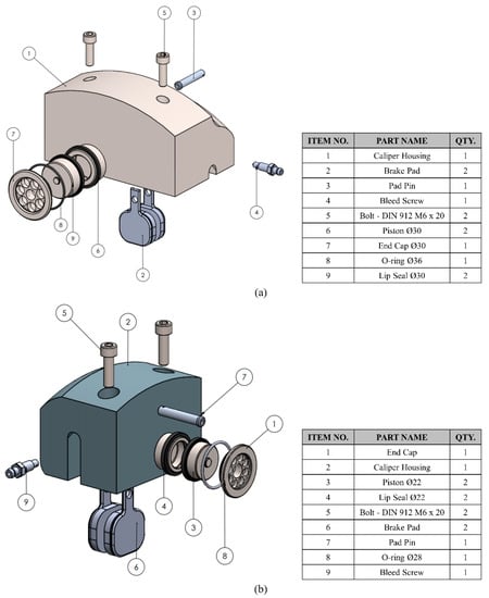 25]. The calipers mostly differ in terms of design, mounting, and operation. On the one hand, the floating calipers move relative to the rotor. Furthermore, they have one or two pairs of pistons only on the inboard side of the rotor. When the brakes are applied, the fluid pressure moves the piston(s), which then pushes the entire caliper creating friction from the brake pads on both sides of the rotor. The floating calipers are prone to sticking failure resulted from dirt or corrosion at their moving components. This can cause extreme heating of the rotor, vehicle’s steering vibration, and reduced fuel efficiency [