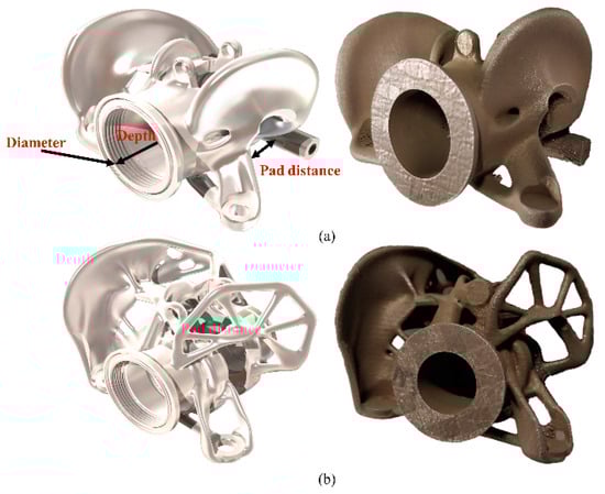 As has been already mentioned, SLM 3D printing was chosen as a manufacturing method for both housings. Hence, a 3D printing preparation of the 3D models should be conducted. The support structure was used on features with more than a 30° overhang relative to the 3D printer plate. In addition, the fluid channels were free to support material. In general, additively manufactured models can suffer from poor surface finish and dimensional discrepancies making inevitable the post-machining of their surfaces interacting with other components such as bolts, bearings, and fitting parts. For this reason, the housings’ surfaces that interact with the other caliper components were designed to be printed with 5 mm extra material.