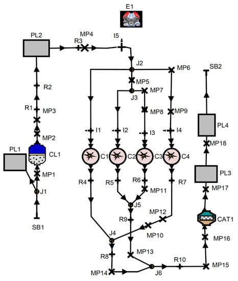 The engine model shown in Figure 1 was developed using AVL BOOST software. The model is equipped with a multi-point fuel injection system (MPFI). The main injectors for primary fuel are I1, I2, I3 and I4. Furthermore, the ammonia is injected by an injector which is installed before the engine intake manifold (I5). The blocks named E1, CL1 and CAT1 denote the engine, air-cleaner and catalyst converter components, respectively. The engine cylinders are shown by C1 to C4, and mufflers are indicated by PL3 and PL4. The legends of the Figure 1 indexes are provided in Appendix A.