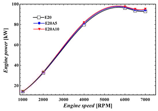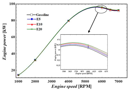 The engine power at various engine speeds at different fractions of ethanol.