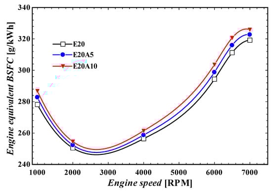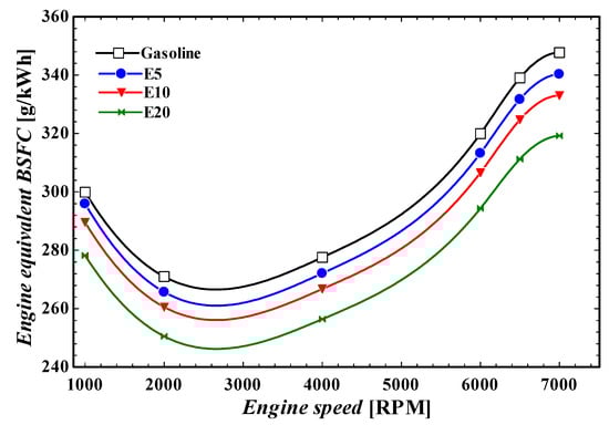 Engine equivalent BSFC at various engine speeds at different fractions of ethanol.