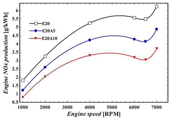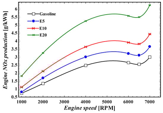 Engine nitrogen oxide production at various engine speeds at different fractions of ethanol.