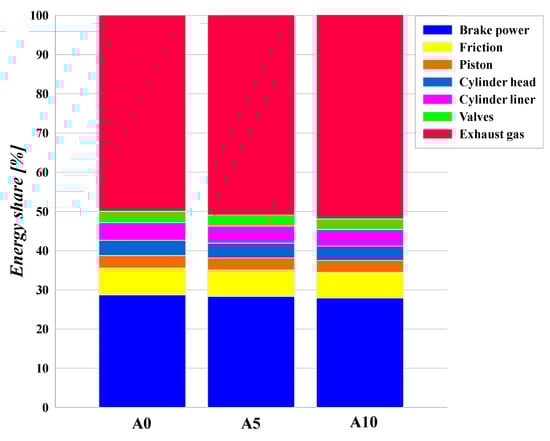 Figure 8 shows the shares of fuel energy converted to brake power, as well as the wasted energy through the friction loss, piston walls, cylinder head walls, cylinder liner walls, valves walls and exhaust gas at engine rated RPM (6000 RPM). As indicated in this figure, the percentage of the fuel energy converted to brake power decreased by 0.4% and 2% following increases in ammonia injection to 5% and 10%, respectively, due to the reduction in the in-cylinder pressure (Figure 9). On the other hand, the share of the fuel energy wasted through the exhaust increased by approximately 2% following the increment of ammonia injection up to 10%. Considering the ammonia lower heating value (LHV), the total fuel energy released during combustion increases following the increment in ammonia injection rate, as confirmed by Figure 10. So, the in-cylinder pressure increased minimally by increasing the ammonia injection rate, as is shown in Figure 9, resulting in a slight increment in engine power shown in Figure 6.