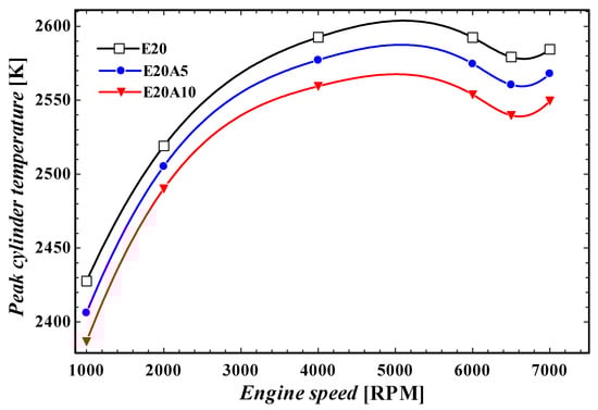 The changes to engine nitrogen oxides emissions and peak cylinder temperature caused by the injection of ammonia at different engine speeds are shown in Figure 11 and Figure 12, consecutively. As discussed before, the ethanol fraction increment in the fuel mixture results in a considerable increase in nitrogen oxides. However, ammonia injection causes nitrogen oxide reduction, as shown in Figure 11. The injection of ammonia up to 5% and 10% led to engine nitrogen oxide reductions of 25% and 48%, respectively, on average at various engine speeds for E20.