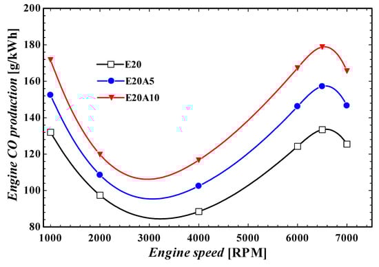 Figure 13 demonstrates the effect of ammonia port injection on CO emission at various engine speeds. The injection of ammonia resulted in a reduction in in-cylinder temperature, as presented in Figure 12. This reduction in in-cylinder temperature will impose a negative effect on engine CO due to the extension of unburnt zones, which directly affects engine CO production. Our results show that an increase in ethanol fraction in the fuel mixture results in a significant decrease in the CO generation rate. However, the port injection of ammonia, up to 10%, leads to a CO increment of nearly 30% at various engine speeds, respectively, which is mainly because of the decrease in in-cylinder temperature and the spread of unburnt zone.