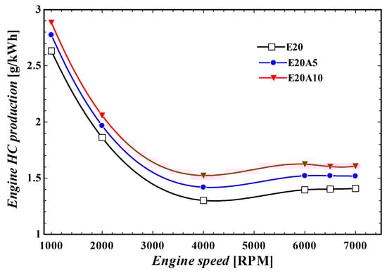 The impact of ammonia port injection on engine HC emission production is shown in Figure 14. Similar to CO, HC production increased by the injection of ammonia. With the port injection of ammonia increased up to 5% and 10%, the HC emission increased by 6% and 10%, respectively. However, the increase in HC and CO emissions caused by the injection of ammonia can be controlled by the employment of efficient catalytic converters in vehicles [,,].