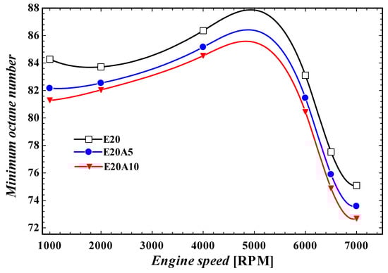 Minimum fuel octane number requirement at various engine speeds at different fractions of ammonia.