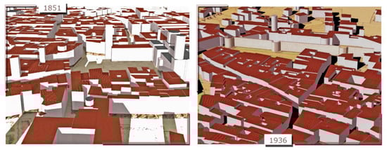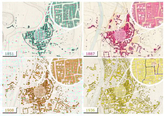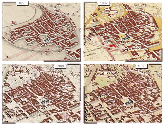 As a part of the TOTEM project, maps from four different years (1851, 1887, 1908, and 1936—Figure 1) were employed for this study. Throughout these years, the more significant changes in the city’s structure have been related to (i) the alteration of the river’s course, which conditioned the urban sprawl of the city and (ii) the progressive demolition of most of the defensive medieval walls. These changes in the urban pattern and the expansion of man-made structures are visible throughout the maps, whereas building functions or planned urban interventions are differently coded.