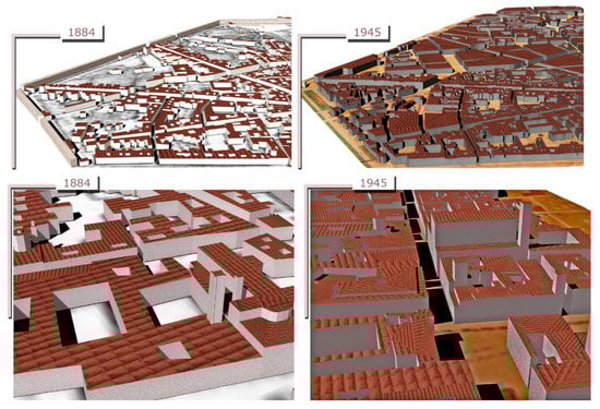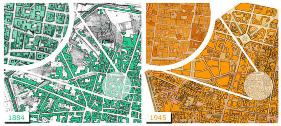 As a further case study, the historic city centre of Bologna was considered. Two historical maps describing the city in 1884 and 1945 were selected and manually digitised in GIS Environment (Figure 3). In the older case, medieval defensive walls surrounding the city are still clearly visible, while in the 1945 map, damages of the Second World War and planned building reconstruction interventions are reported. Moreover, in this case, the two historical maps’ level of information is quite different. In the oldest representation (1884), few details on the building blocks partitioning are provided with respect to the more recent map (Table 3).