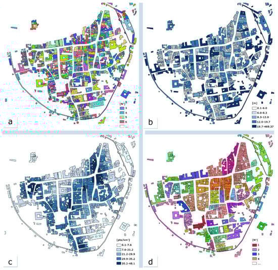 - Group: the aggregation of polygons in building blocks (Figure 6d). A “group” value is assigned to each polygon belonging to the same building block, while isolated buildings are grouped;