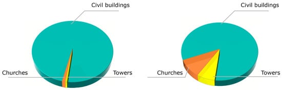 As reported in Section 5.1, two buildings’ classes proved to be an under-represented category in the training data, namely religious structures and civil towers. A data augmentation approach was therefore applied to reach a more balanced class representation and more accurate reconstructions of these few but relevant buildings, describing the city-skyline and aspect.