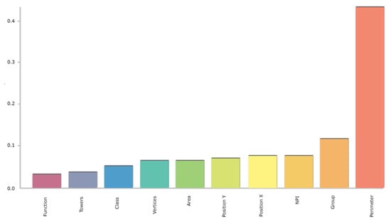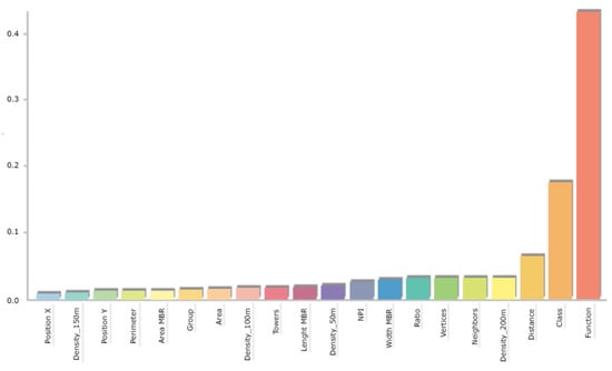 After the manual digitisation of building footprints and each historical map’s georeferencing, several attributes (predictors—Section 4.2) were computed. For training the predictive models, footprints and their respective height values derived from the actual topographic data (2016) were employed (Table 2). From this data set (Figure 2), some temporally inconsistent constructions, as recent and industrial structures, were removed to avoid erroneous predictions.