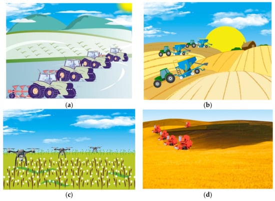 In Figure 1a multiple rotary tillers are being used to plow rice fields on sloping land to safeguard food production and mitigate the impact of the phenomena of lack of labor resources, which is brought about by the New Crown epidemic [17]. In Figure 1b, multiple corn planters are employed to sow seeds in a large field, which saves labor and ensures the quality of seeding, and directly improves the yield and quality of corn planting [18]. In Figure 1c, multiple drones are used to spray pesticides in cotton fields, which could be targeted according to the types of pests and diseases, and also prevented their rapid spread in the early stages of infestation [19]. In Figure 1d, it has become a trend to manually operate multiple combines simultaneously during the wheat harvesting season to avoid the effects of rainfall on wheat quality and yield [20].