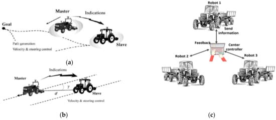 The centralized architecture of an agricultural mobile multi-robot system. (a) One of the guided following modes, where the slave robot follows the travel path taken by the active robot [27]. (b) Another of the guided following modes, where the slave robot is ordered by the master robot to go the other way [27]. (c) The centralized control mode is usually a back-end computer that monitors, plans, and controls the robot’s tasks and operating paths.