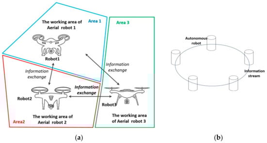 Compared with the operating environment of UGVs, the operating area of UAVs has the advantage of no obstacles, so these systems generally adopt the distributed structure [28]. As shown in Figure 3, the three UAVs in the multi-robot system carry out agricultural situation monitoring in the individual workspaces independently; each robot of this system had a high degree of autonomous operation ability and can complete a given task according to its aims; robots can communicate with each other, exchange information, and coordinate their behaviors equally and independently to complete a given task [28]. This structure has strong scalability and certain advantages in real-time operation, fault tolerance, and reliability, etc. [29] and is suitable for handling tasks related to spatial states [30]. However, “it costs a lot in terms of the coordination mechanism, such as task allocation and motion planning” [29].