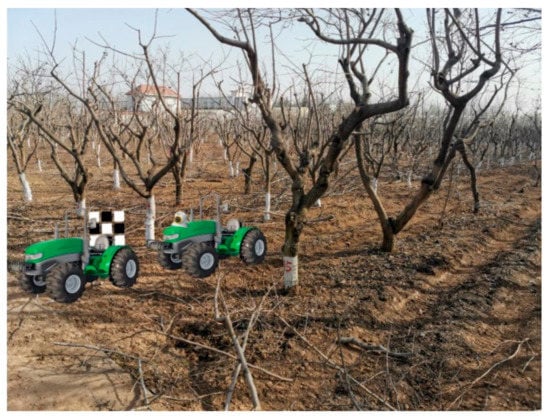 For example, the black-and-white checkerboard feature board was fixed to the leader robot as the following feature, and the 3D information of each corner point on the black-and-white checkerboard feature board was obtained by the binocular vision camera fixed to the following robot, and the information was analyzed to finally obtain the longitudinal spacing, lateral offset and heading declination of the following robot relative to the leader robot. Using this navigation information to realize the automatic following of the following vehicle, the following system of master-slave orchard operation vehicle is established [38].