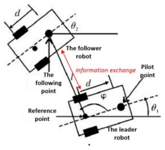 In the absence of information exchange, the robot relies on its sensors to obtain relative distances and angles by observing the neighboring robots for self-positioning [35,36]. As shown in Figure 4, the leading robot guides the follower robot to steer along the leading robot reference route [37].