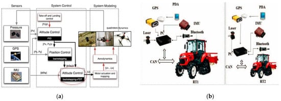 Heterogeneous sensors carried by agricultural multi-robots. (a) Typical sensors for aerial robots: inertial measurement unit (IMU), Global Positioning System (GPS), and pressure gauge [28]. (b) Typical sensor for ground robots RT1 and RT2: GPS, Laser, and IMU [45].