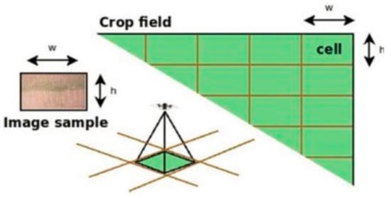 As shown in Figure 7, Bouzouita et al. [28] obtained georeferenced pictures through UAVs and then created a full map of a vineyard. The processing entails first dividing the UAV workspace into multiple regular grids and defined borders (line segments of workspace in the grid-based environment) using Bressenham’s linear algorithm (BLA). Then, the procedure to distinguish the subareas in the grid-based environment is a recursive flood-fill algorithm that picks an empty cell (not marked as occupied) and floods in four directions while there are empty cells, and each flooded cell is marked as occupied. This mapping procedure is repeated until all nodes of the grid are occupied by georeferenced pictures. However, the drawback of this mapping is a tradeoff between acquiring an equally sized set of images in cells and inefficient aerial sampling with UAVs.