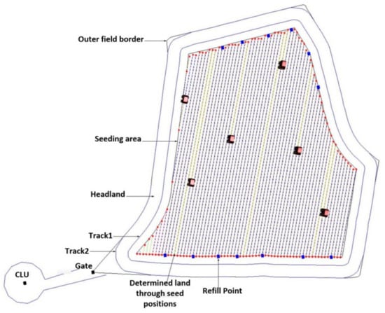 A centralized entity was used to plan the seeding task, seeding patterns, and seed densities for different robots in the simulation environment. At the same time, the centralized entities were used to monitor the whole seeding process to avoid collisions between robots [58]. The small blue dots are the locations of the seeds planned to be sown, the yellow dots are the seeds that have been successfully planted, and the larger red dots are the border seed sowing locations.