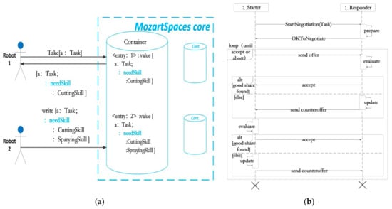 Distributed task allocations: (a) An entry was stored in task storage with ID numbers. And robots could select ID to work according to the relationship between the robot’s function and the task requirement [85]; (b) A task was split into several subtasks. And each robot proposed the largest possible task allocation initially, then gradually decreased its offers based on negotiation mechanism until a deal was done [28].