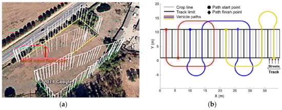 - Conesa-Munoz, J.; Ribeiro, A.; Andujar, D.; Fernandez-Quintanilla, C.; Dorado, J. Multi-path planning based on an NSGA-II for a fleet of robots to work on agricultural tasks. In Proceedings of the 2012 IEEE Congress on Evolutionary Computation (CEC), Brisbane, Australia, 10–15 June 2012; pp. 1–8. [Google Scholar] [CrossRef]
