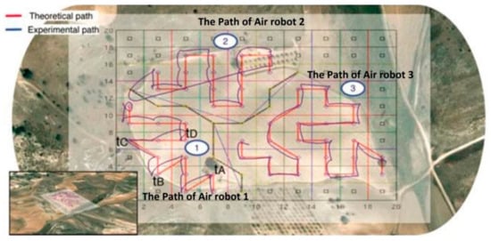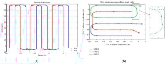 More practical applications indicate that the cooperative positioning of multiple robots in agriculture is replaced by a central controller or task manager coordination mechanism [49,50]. That is, the working area and travel path of each robot are planned by a task manager or central controller based on the established environment map. The work areas and work paths of these multiple robots usually do not intersect and each robot only needs to localize and navigate based on its sensors. For example [27], the vineyard area was divided into three UAV-monitored vineyard areas using the task manager according to set rules, and path planning was performed for the sub-areas of individual UAV operations, with each UAV flying at a different altitude to avoid collisions between the UAVs.