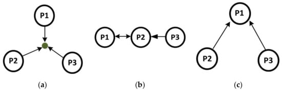 A reasonable architecture can guarantee information flow and control flow in the agricultural multi-robot system and make effective cooperation among multiple robots possible [22]. At present, the architecture of agricultural multi-robots can be divided into centralized architecture and distributed architecture. It is found that the earliest recorded structure of agricultural multiple robot systems comes from hay harvesting and transportation robots in farmland [23,24], for which these multi-robot systems were operated under the principle of centralized architecture. As shown in Figure 2a, in leader-follower mode, a relatively powerful robot is selected as the “leader” of the swarm robots, performing specific motion planning for the remaining robots after analyzing and processing the sensory information, but these remaining robots are just executors, without the ability to choose their actions or coordinate with each other. Alternatively, as shown in Figure 2b, in the central controller mode, each robot can perform tasks independently and is commanded by a central controller [25]. The advantage of this centralized architecture is that the theoretical background is clear, and the implementation is intuitive, but the flexibility, fault tolerance, and adaptability are poor [26].