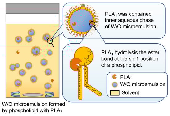 Schematic illustration of hydrolysis reaction in water-in-oil (W/O) microemulsion of non-immobilized phospholipase A1 (PLA1).