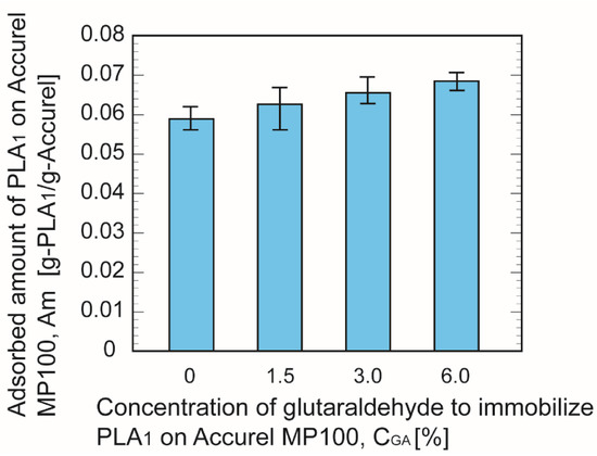 Despite the small difference in the immobilized amount of PLA1 between GA concentrations of 0–10%, the amount of produced palmitic acid varied dramatically. Therefore, the GA concentration not only effectively immobilized the PLA1 but also acted as a hydrophobic modifier of the carrier surface.