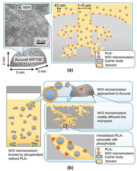 (a) Schematic illustration of pore structure and W/O microemulsion droplets association with immobilized phospholipase A1 on the outer and inner surfaces of microspores in Accurel particles. (b) Phospholipid-based W/O microemulsion droplets readily diffused into the microspores of the PLA1 carrier.