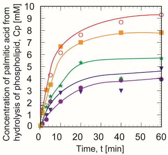 The enzymatic reactivity of PLA1 was determined by the hydrolysis of the phospholipids in W/O microemulsion. The PLA1 was solubilized into 0.2 M acetate buffer solution (pH 5.0). The enzyme buffer solution was prepared using 0.4 g of PLA1 powder and 10 mL of acetate buffer solution. The organic solution (50 mL) was prepared in 10% (v/v) 1-butaol/isooctane. The phospholipids were dissolved into the organic phase with a concentration of 6–18 mM, calculated based on phosphatidylcholine. The substrate organic solution was magnetically stirred in a thermostatic water bath (313 K). The enzymatic reaction was initiated by introducing PLA1 into the organic solution, which formed a W/O microemulsion. A supplemental amount of acetate buffer solution was then added to the W/O microemulsion to make the desired water content. The enzymatic reactivity was determined by measuring the increase in palmitic acid concentration according to the Lowry-Tinsley colorimetric method [26].