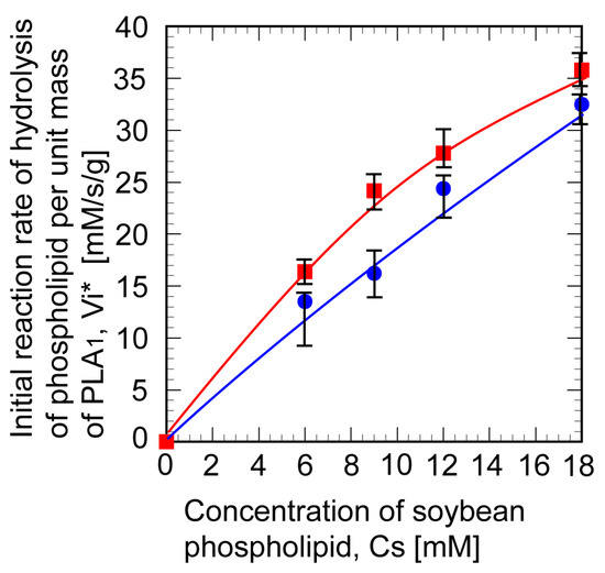 Figure 8 shows the change of the initial reaction rate with the concentration of lecithin using a soybean dissolved in the organic phase. The initial reaction rate in this figure was a recalculated value which was a per unit mass of PLA1. The reactivity of immobilized PLA1 indicated by the initial reaction rate per unit mass of PLA1 was well maintained, and the activity damage was fully suppressed. Industrial-class PLA1 was successfully immobilized onto the Accurel particles with the aid of GA aqueous solution.
