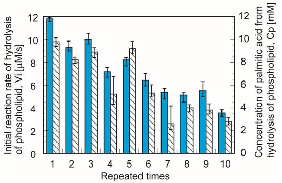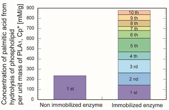 Figure 11 indicates the accumulated yield of palmitic acid after 60 min using immobilized PLA1 throughout 10 cycle’s repetition. Accumulated production was 3.5-fold superior to that of a single use of non-immobilized PLA1. Immobilization of industrial-class PLA1 was successfully realized as a promising biocatalyst for production of the phospholipid biochemicals.