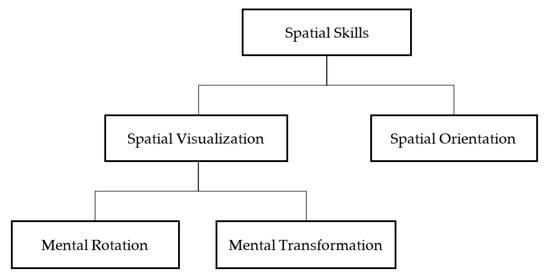 Spatial skill is a component of human intelligence. It is understood as the ability to generate, retain, retrieve, and transform well-structured visual images []. However, as seen in the definition itself, there is no clear agreement about the subskills or components that shape this ability []. For example, McGee [] distinguishes five components of spatial skills: spatial perception, spatial visualization, mental rotation, mental relationships, and spatial orientation.
