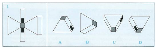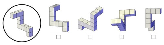 The Mental Rotation Test (MRT) created by Stephen Vandenberg [] contains 20 items in which the individual taking the test has a block figure in three-dimensional perspective. They are then shown four block figures with a different orientation, from which they must choose two that correspond to the model block (see Figure 3). The maximum score on this instrument is 40 points.