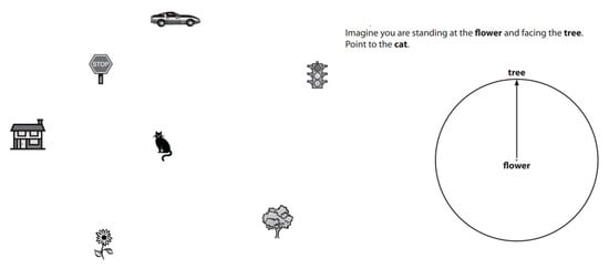 The Perspective Taking/Spatial Orientation Test (SOT) created by Hegarty and Waller [] consists of 12 items in which the user must imagine themself located in the position of one of the objects in a set (which will become the center of the circle) looking at another item (which will become the top of the circle). In response, they must draw an arrow from the center object indicating the direction to a third object from the new orientation (see Figure 5). The score of each item is the absolute deviation in sexagesimal degrees between the individual’s answer and the correct answer, so that a lower score in the test results in a higher score. The ability to orient oneself in an environment and to imagine how it looks from different viewpoints requires different skills than does being adept at spatial transformations of individual objects [] (spatial visualization).