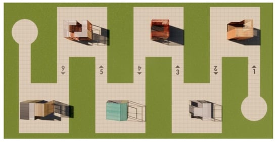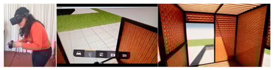 The initial contact was made with all the participants to obtain their general information and to inform them of the dates and times they would have to individually attend the experiment. Only one 45-min session was required for each participant. The first 15 min were used to practice and become familiar with the HMD, the immersive virtual reality environment and the haptic (handheld) controllers to be able to move in the virtual space. Once inside the virtual environment, for a period between 20 and 25 min, the participant had the possibility to take an immersive virtual tour of an open space where the six ephemeral architecture modules were located. The participant autonomously walked along the pedestrian path, being able to look all around, bend over, turn around and be transported directly to some point in order to observe both the space inside and outside, as well as the materials, shapes and dimensions (Figure 10, Figure 11 and Figure 12).