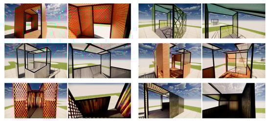 For the second part of the experimentation, the same set of six architectural spaces was used, but on this occasion the three-dimensional virtual models were created with SketchUp pro 2019, where various materials, textures, colors and natural lighting were assigned (Figure 8). Then, the Enscape 3D virtual reality application (https://enscape3d.com) was used for their respective visualization. Finally, each student, with the use of the HMDs, underwent a virtual tour of each one of the spaces while having their perceptions and sensations recorded.