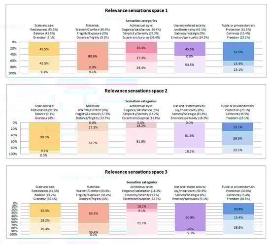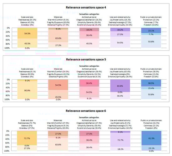Table 6 shows the sensations that the designer expects the users to perceive from their designs and the real sensations that the participants perceived when experiencing and walking through such spaces in an immersive virtual reality environment. The percentage indicates the degree of agreement of the user with the designer. The average degree of coincidence considering the six spaces evaluated reaches 72.29%.