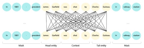 As shown in Figure 3, local context is part of the input sentence. Based on O from Section 3.4, it will be divided into three parts: head entity , tail entity , and context between the two entities , where represents the length of corresponding sequence, respectively. Other parts of the sentence will be masked.
