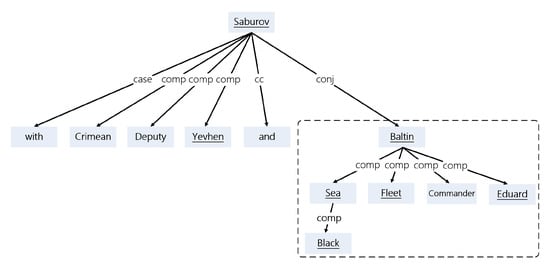 Case 1 represents a kind of situation where the prediction of a relation between two entities is related based on corresponding entity types, but in fact they are not related in the sentence. We draw a pruned syntax tree of the example by the LCA method illustrated in Figure 4. The subtree in the bottom right corner represents the LCA tree corresponding to the two entities with correct results. For “Black Sea Fleet”, we see that “Eduard Baltin” has a direct modified relationship with it, but “Yevhen Saburov” does not. From the dependency tree, we can obtain a structural modified relationship between entities, which has a positive impact on relation extraction performance. In addition, it is easy to find out that, if we adopt the SDP method, “Commander” will be off the tree. However, “Commander” has strong instructions for extracting the relation “Work-for”. Therefore, the LCA method can keep more important information.
