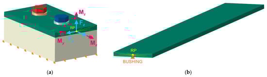The red dashed line in Figure 1b shows a section plane in which part of the model is replaced by a bushing connector connected to ground. In Abaqus, connection type BUSHING provides a connection between two nodes that allows independent behavior in three local Cartesian directions and that allows different behavior in two flexural rotations and one torsional rotation. The equivalent FE model can be seen in Figure 2b. Figure 2a shows a separate (removed) part of the model that was used to calculate the stiffness coefficients of the bushing. These coefficients were determined by a series of six linear static analyses in which the residual part of the beam was loaded in all six degrees of freedom, respectively. The load was represented by a unit force and a unit moment acting at the reference point (RP). The transfer of the load from this point to the cross-sectional area of the beam was realized through a distribution coupling. In addition, the pretension was defined in the bolts. The preload force was set 10 kN. Since this is a contact task, frictional contact interactions were defined between all components. The friction coefficient was set to 0.2. In the normal direction, so-called hard contact was enforced. The underside of the base was fixed. The finite element mesh was formed by hexagonal elements with an average size of 1.5 mm.