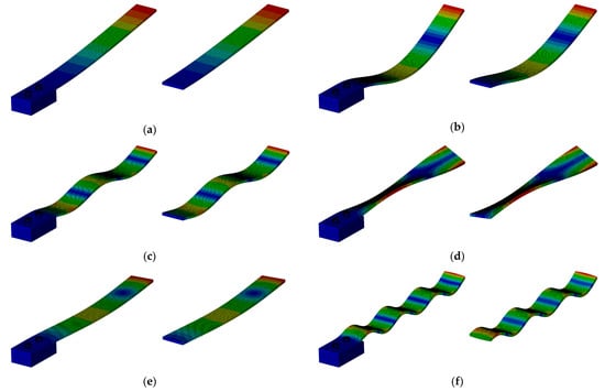 Selected mode shapes of compared FE models: (a) 1. mode; (b) 2. mode; (c) 6. mode; (d) 7. mode; (e) 8. mode; (f) 14. mode.