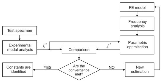 In this method, the stiffness coefficients are calculated based on the natural frequency values obtained by experimental modal analysis (EMA). The coefficients are determined in the parameter optimization process, which is based on frequency FEM analysis. By changing the stiffness of the bushing, the model is retuned, which is reflected in a change in its modal properties. During the optimization, the FE model is iteratively updated until its natural frequencies match the measured values with acceptable accuracy. It should be noted that the shape, dimensions, and material properties of the structure must be well known in advance. Flowchart of the updating process is shown in Figure 4.