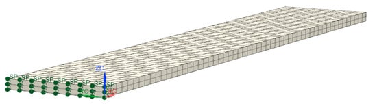The equivalent stiffness coefficients calculated by the above procedure were used in the definition of the bushing connector in the equivalent FE model. Their values are given in Table 2. The assumption of the equivalence method is that the finite element model modified in this way retains the stiffness properties of the original model and can therefore be used in further static or dynamic analyses. In order to verify this assumption, both FE models, the complete reference model (Figure 1a) and the equivalent model (Figure 2b), were subjected to modal analysis to assess their modal properties. A Lanczos eigensolver was used to calculate the natural frequencies and the modes shapes of the beam in the frequency range up to 5000 Hz.
