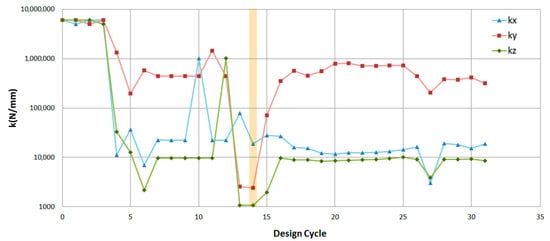 - Design Variables:kx (N/mm), Initial value = 6×106, Lower limit = 500, Upper limit = 106ky (N/mm), Initial value = 6×106, Lower limit = 500, Upper limit = 106kz (N/mm), Initial value = 6×106, Lower limit = 500, Upper limit = 106
