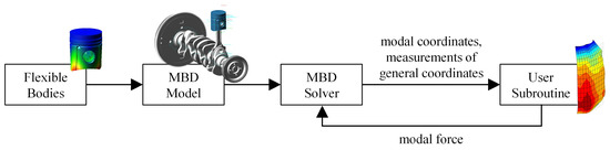 19] presented a comparison of three different reduction methods for elastic structures with lubricated interfaces (Craig–Bampton method, Craig–Bampton two-step method and the load dependent reduction strategy), which they applied to the slider-crank mechanism. The most complex and demanding way to calculate the body deformation in the MBD model is done by using the finite element method in co-simulation [